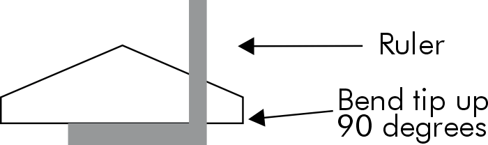Now it is time to bend the winglets. Lay the wing on a table and extend the wing tip past the table edge about 3”. Lay a square or a ruler along the same pencil line from the above step. Pushing down on the ruler with one hand and bending the wing tip up with the other. Bend each winglet to 90 degrees. For flight, bend winglet back down to 30 degrees.
